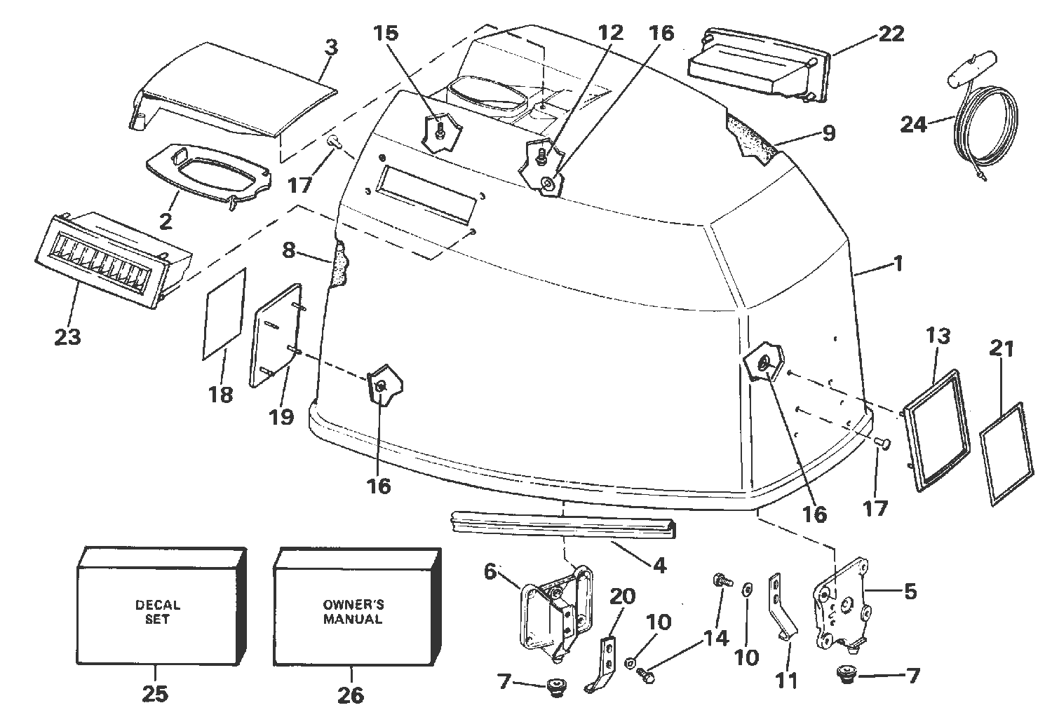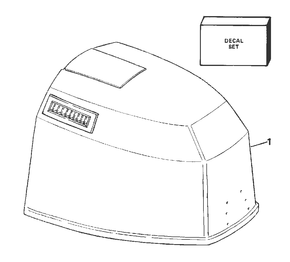 21 0209355 APPLIQUE, Motor cover front. USED ON 75 MODELS MODELS WITH "J" SERIAL NUMBER PREFIX